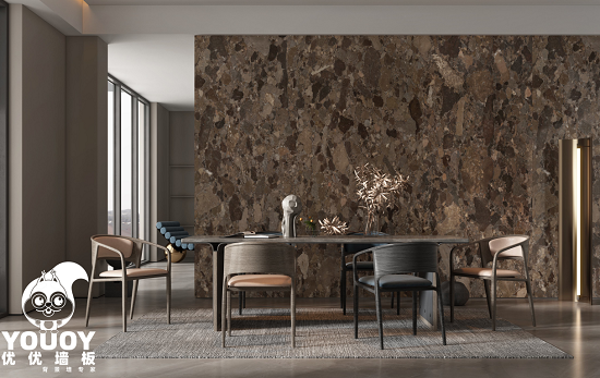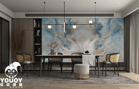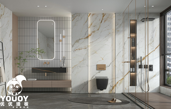 YOUOY墙板另一大特色即为它的成分。YOUOY墙板主要成分为天然石粉和柔性材质,不似理石和瓷砖的冰冷触感,天然大理石粉与水无亲和力,触感温和,并且表面质密,在卫生间或者地下室等潮湿的空间使用,防水防潮,使用更加持久,是房屋装修,酒店等公共区域翻新的首选材料。