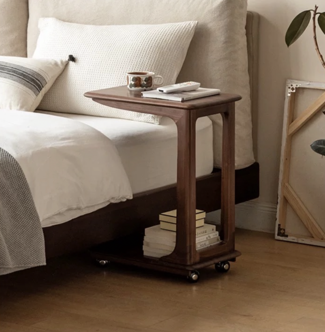 卧室里,黑胡桃木的床头小几取代堆满杂物的床头柜,睡前阅读成为比刷手机更自然的选择;