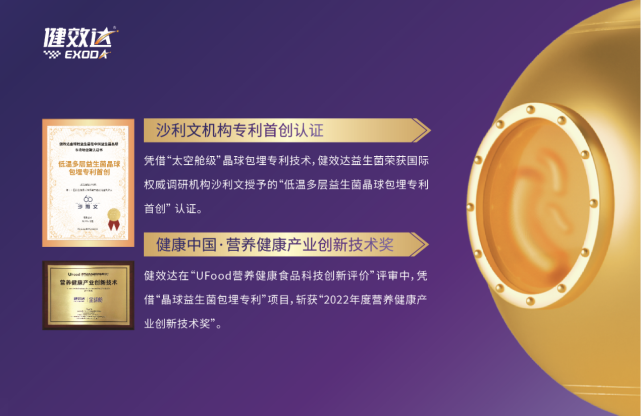 凭借晶球包埋专利技术,健效达晶球益生菌获得了国际权威调研机构沙利文授予的“低温多层益生菌晶球包埋专利首创” 认证,并在“UFood营养健康食品科技创新评价”评审会中斩获“营养健康产业创新技术奖”,品牌发展潜力引发行业高度关注。