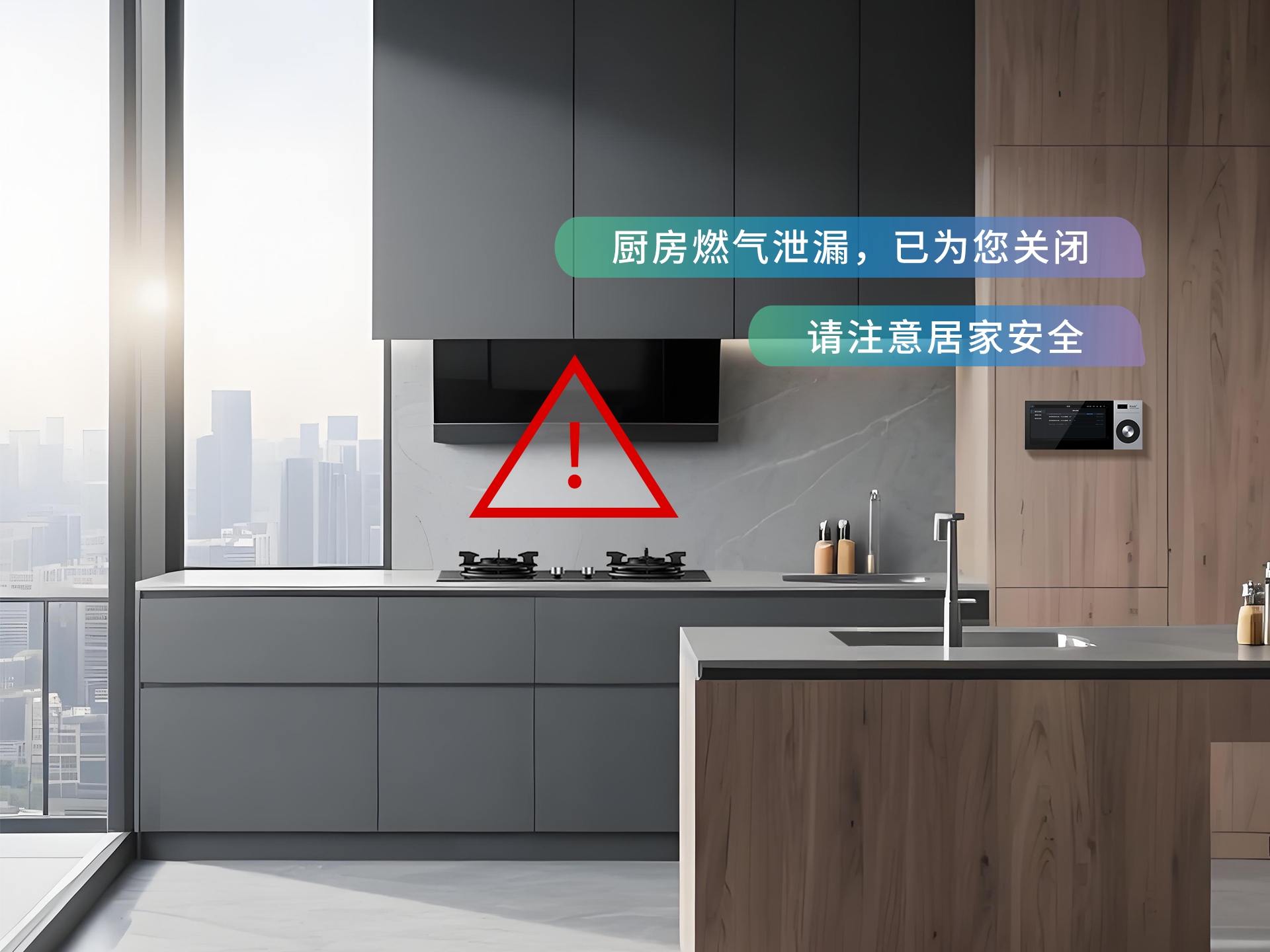厨房安全隐患频发?狄耐克通过燃气、水浸传感器实时监测,异常时自动关闭阀门,并通过智慧家庭中控屏弹窗、灯光闪烁等方式多维告警,构建“预警—干预—防护”的闭环安全体系。