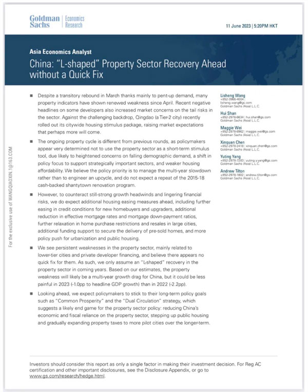 全球的投行高盛资本在2023年6月13日发文称:中国地产将进入“L型”复苏阶段。