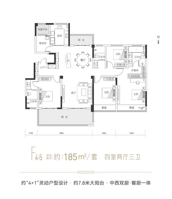 其中185㎡户型南面阳台宽度达到了7.8米,这个宽度将给客厅、餐厅带来更好的采光效果;北阳台与餐客厅成一条直线,打开两个阳台门即可快速通风换气;家政间紧邻厨房,中西双厨一体设计方便保姆做饭;三卧室朝南,卫生间全部带窗户,拒绝暗卫;主卧同时拥有衣帽间与独立卫生间,这是多少女主人的梦!