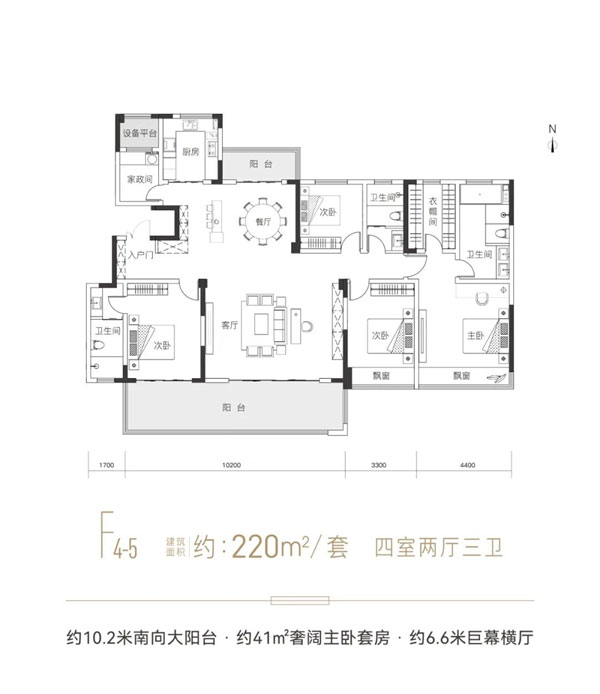 御花园拥有185㎡、220㎡两种四室两厅三卫的户型,且均为南北双阳台设计。