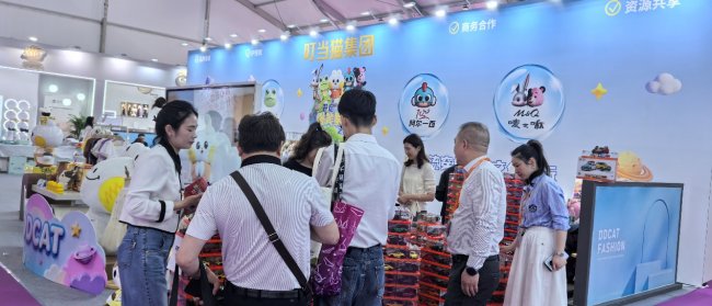 在展位,B端客户在洽谈区与品牌方深入交流IP联名与品类拓展方案,C端观众则在互动区与角色人偶合影、参与“翻车挑战”小游戏。