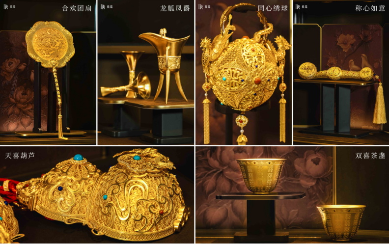 •六礼礼器迎吉祥——合欢团扇、龙觚凤爵、同心绣球、称心如意、天喜葫芦、双喜茶盏