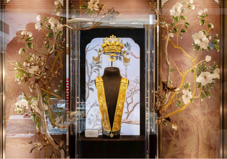 体验店汲取东方古典园林的灵感,以当代简约和法式浪漫的设计笔触,将其转译为现代视觉体系。尚未步入门店,就能感受到扑面而来的中式气韵:金色门头下,橱窗内是拔地而起、蜿蜒而上的连理枝,比翼鸟栖居其上,还原“在天愿作比翼鸟,在地愿为连理枝”的美好意象。九龙凤冠与黄金霞帔陈列其间,无声诉说大气庄严的婚嫁古韵。就连门把手都取自八瓣海棠的美好意象,推开它,便正式进入东方婚嫁世界。