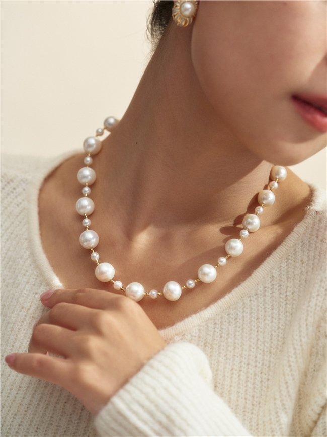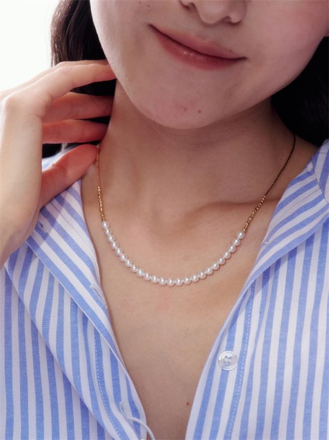 如果说全珠链是白笙丽的“实力宣言”,微笑链是“温柔注解”,那么满天星就是“灵动的诗篇”。“山湖星空-白笙丽满天星项链”将5-13mm渐变尺寸的白笙丽珍珠错落排布,大珠为星、小珠为辰,如同将细碎星光萦绕颈间。每一颗珍珠之间以18K金隔珠衔接,金与珍珠的光泽相互映衬,精致到每一个细节。这不是传统的串珠逻辑——而是一场关于“如何让顶级珍珠轻盈起来”的设计实验。白笙丽珍珠的高品质,在这里不必端坐高台,而是化作颈间一抹灵动的星光,温柔又灵动。