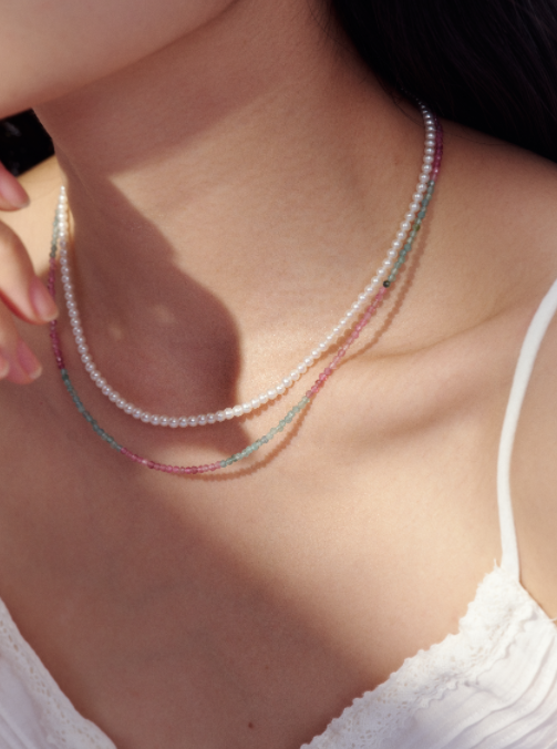 上层是极细巴西碧玺串珠,每颗刻面都折射出细碎火彩,阳光下宛若彩虹戴在颈间;下层是3-4mm迷你淡水珍珠,温柔莹润。两层链身并行却不冲突,自带“松弛感叠戴”效果。搭配白衬衫、浅灰西装或极简针织衫,彩虹色瞬间点亮整体气色,珍珠的温润又将跳跃色彩拉回优雅尺度。通勤得体不失精致感,一件套组即可完成高阶叠戴。