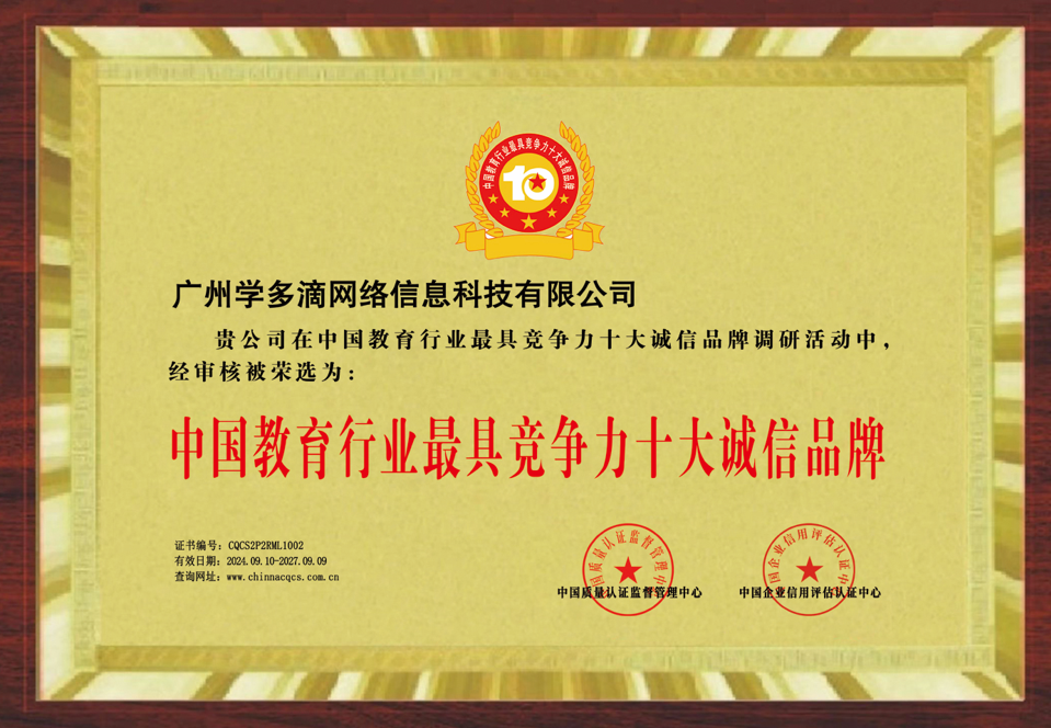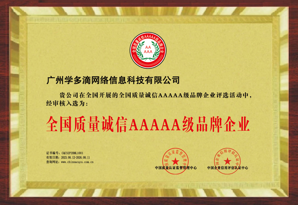 学多滴教育的荣誉之路,是一部以用户需求为驱动、以品质提升为目标的持续进化史。企业先后获评“广东教育行业先进单位”“优质诚信教育培训机构”,彰显其在区域教育市场的领先地位与全国范围内的品牌影响力。其中,“中国教育行业最具竞争力十大诚信品牌”的入选,与众多头部企业同列榜单,评审委员会特别指出,学多滴教育通过AI智能题库、学习过程可视化认证等技术,实现了“教学质量可量化、学习效果可追踪”,为行业树立了诚信经营的新范式。而“全国质量诚信AAAAA级品牌企业”的认证,则由国家市场监督管理总局指导颁发,需通过产品质量、服务标准、社会责任等300余项指标考核。