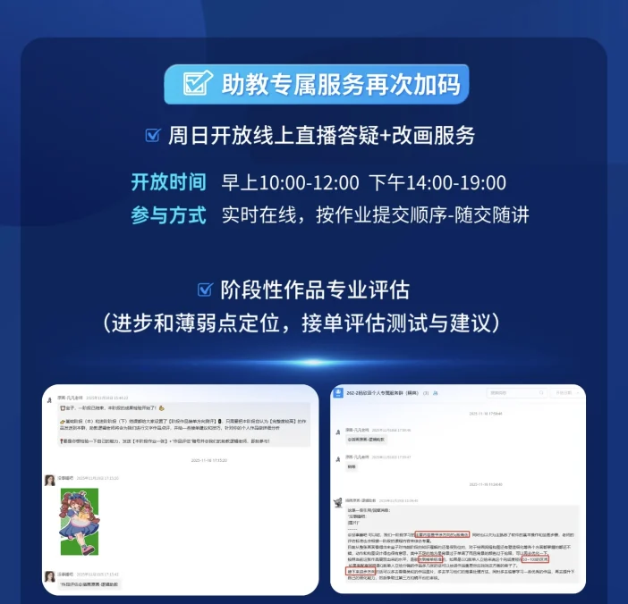 1、周日开放直播答疑+改画服务,随交随讲,实时反馈
