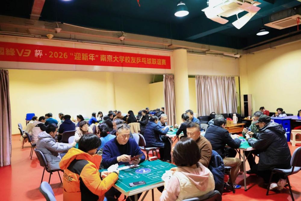 1月3日,2026“迎新年”南京大学校友乒乓球联谊赛于南京奥体中心乒乓球馆在热烈的气氛中成功举办。本次活动由南京大学教工乒乓球协会、南京大学南京校友会乒乓球俱乐部为指导单位,由江苏省大众乒乓球运动发展研究院、南京市建邺区乒乓球运动协会主办单位,江苏今世缘酒业股份有限公司为冠名单位;本次比赛旨在为南大校友搭建互动平台、促进校友与母校的情感联结,吸引了校内外今150名校友积极报名,踊跃参与。