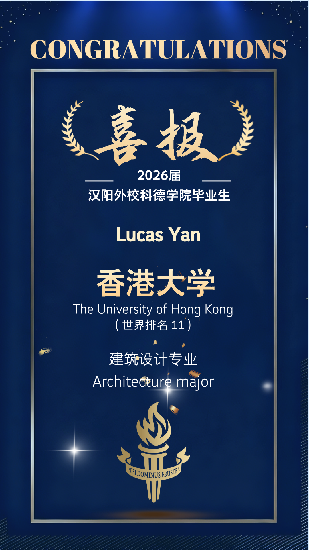• Lucas Yan 一人包揽三校 Offer:世界排名 11 的香港大学建筑设计专业、世界排名 32 的香港中文大学艺术专业,以及香港排名 8 的香港岭南大学艺术专业,跨校跨专业表现彰显国际课程培养的综合素养;