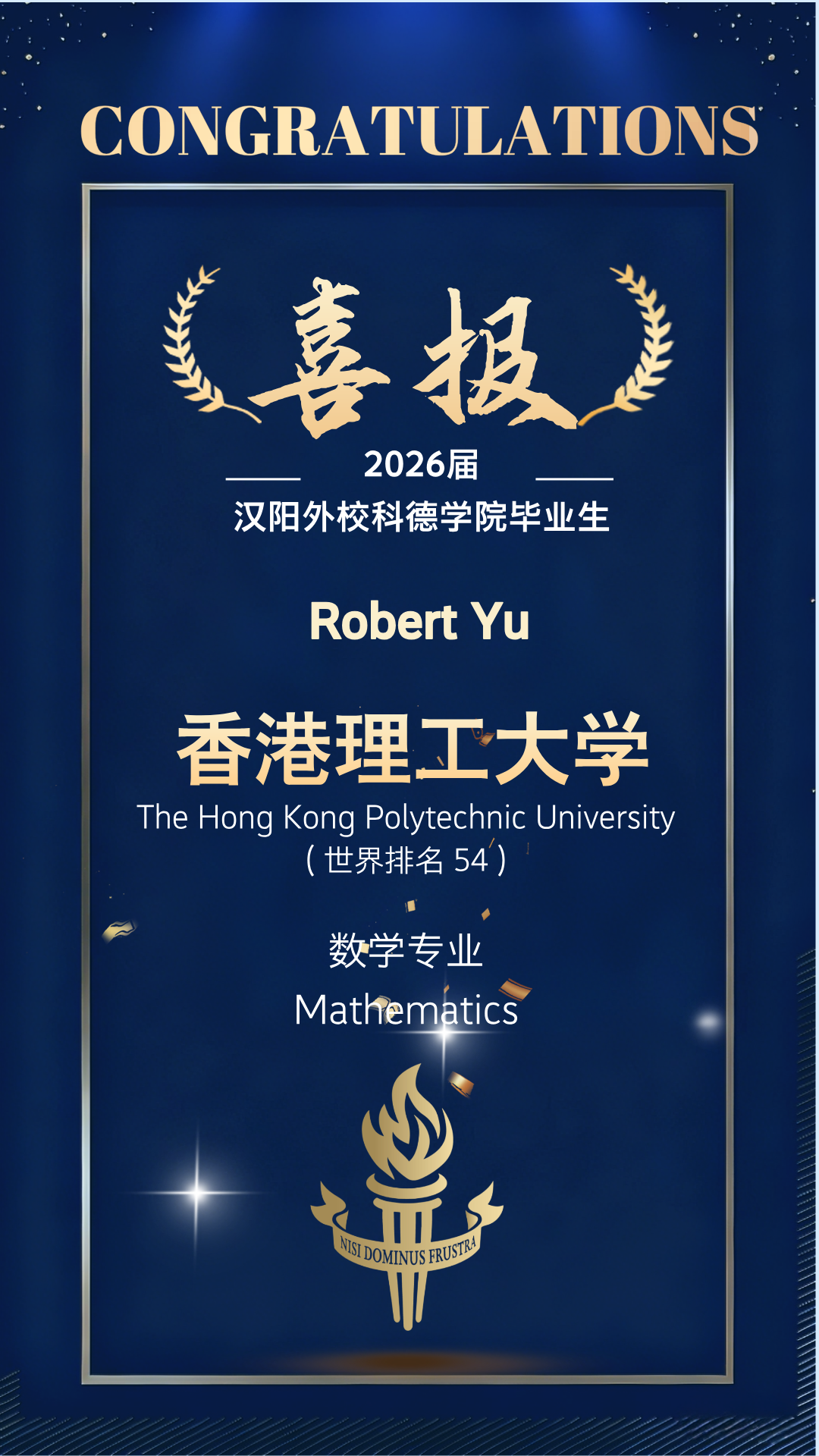• Robert Yu 成功突围:将世界排名 54 的香港理工大学数学专业 Offer 收入囊中,为升学成绩单再添亮色。