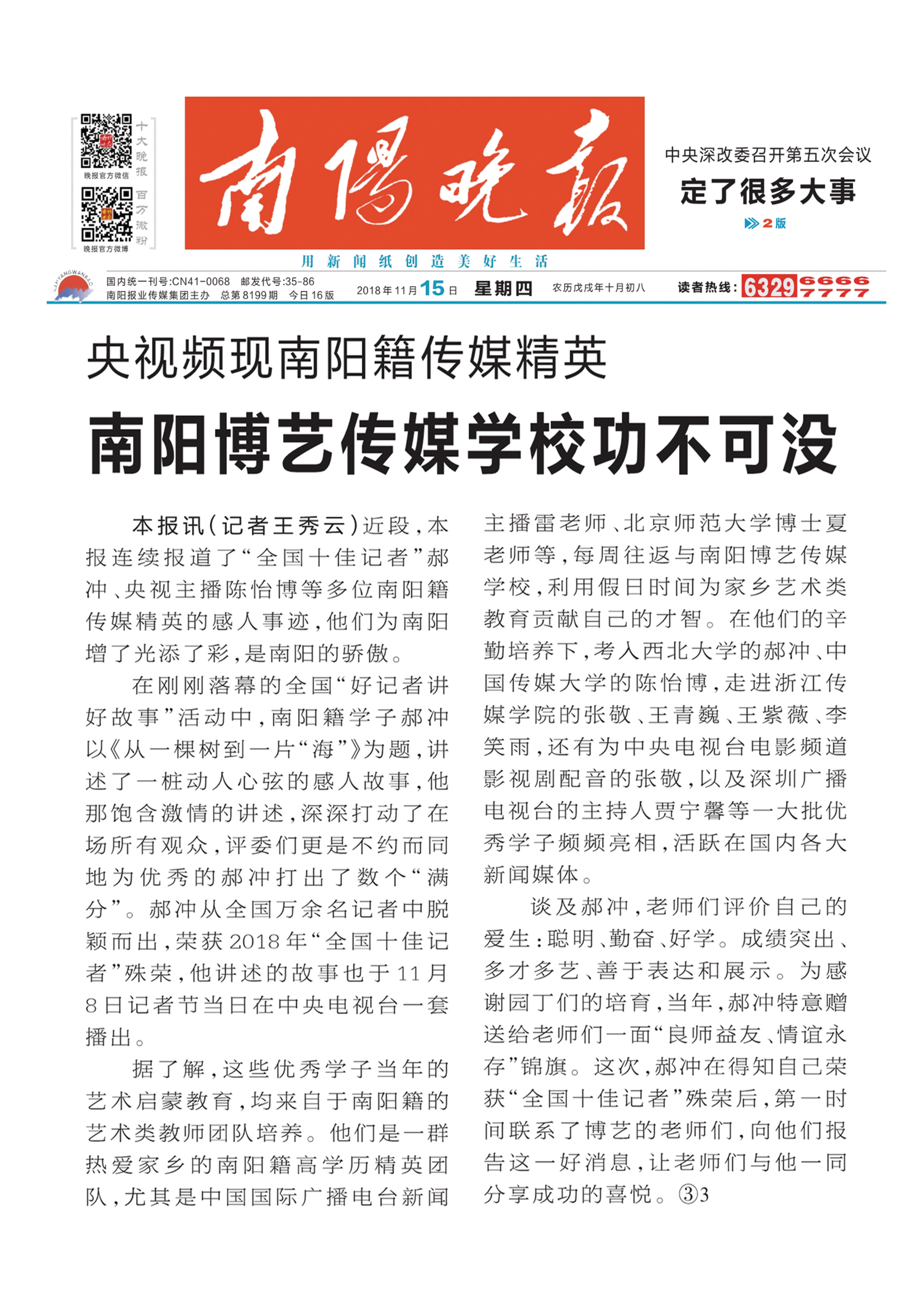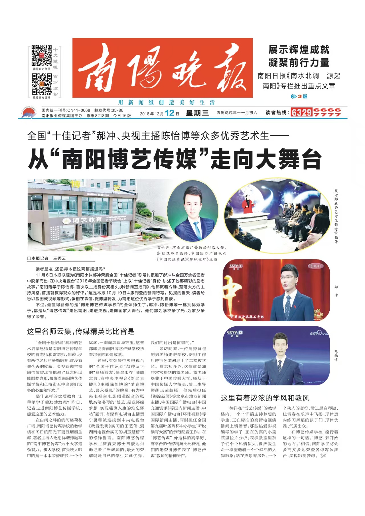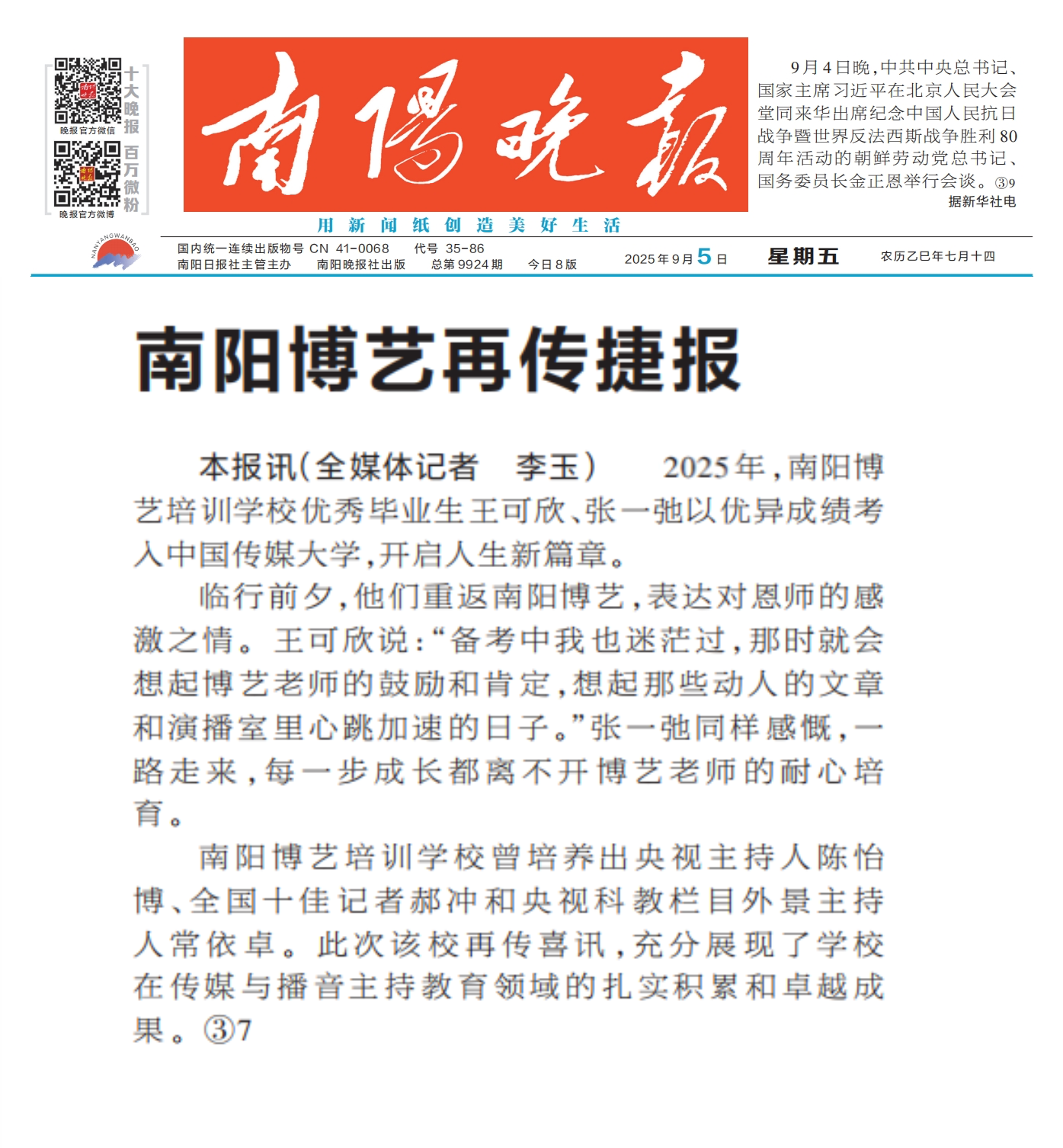 据了解,该校连续多年包揽河南省统考南阳市状元,在全市播音艺考培训领域保持了显著的领先优势。另据《南阳晚报》报道,仅2025年,南阳博艺培训学校就有两名优秀毕业生——王可欣和张一弛,以优异成绩考入中国传媒大学,开启人生新篇章。临行前夕,他们重返母校,表达对恩师的感激之情。王可欣回忆起备考经历时说道:“备考中我也迷茫过,那时就会想起博艺老师的鼓励和肯定,想起那些动人的文章和演播室里心跳加速的日子。”张一弛同样感慨,一路走来,每一步成长都离不开博艺老师的耐心培育,早在2019年,《南阳晚报》就报道过南阳博艺学校培养出的优秀南阳籍媒体人央视主持人陈怡博、全国十佳记者郝冲和央视科教栏目外景主持人常依卓等,为社会输送了大量传媒人才。