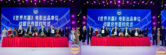 大会还举行了世界共赢电影出品单位战略合作签约仪式,美国代表艾伦凯蒂 Allen Katie、伊娜,中方代表周建平总裁、张利民总裁进行了第一轮战略签约。 韩国代表朴钟灿会长、李性钟总裁,中方代表刘昊秘书长、夏红星副局长进行了第二轮框架签约。