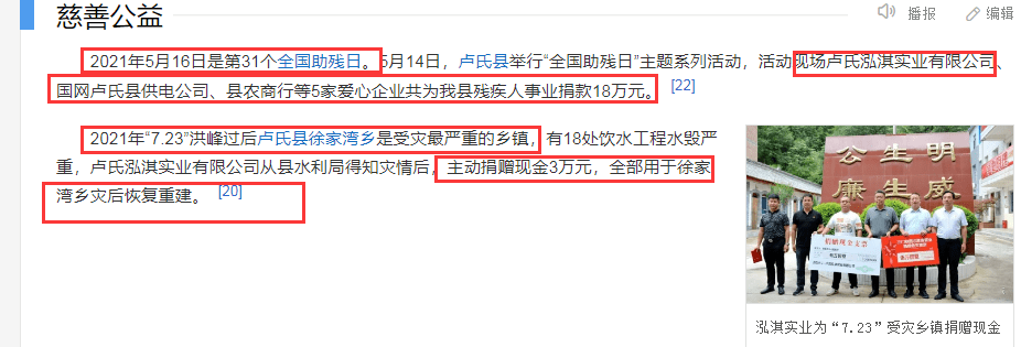 例如,2021年5月16日是第31个全国助残日。卢氏泓淇实业有限公司、国网卢氏县供电公司、县农商行等5家爱心企业共为我县残疾人事业捐款18万元。 2021年“7.23”洪峰过后 卢氏县 徐家湾乡是受灾最严重的乡镇,有18处饮水工程水毁严重,卢氏泓淇实业有限公司主动捐赠现金3万元,全部用于徐家湾乡灾后恢复重建。事实上,这仅仅是泓淇实业在公益慈善道路上的冰山一角。