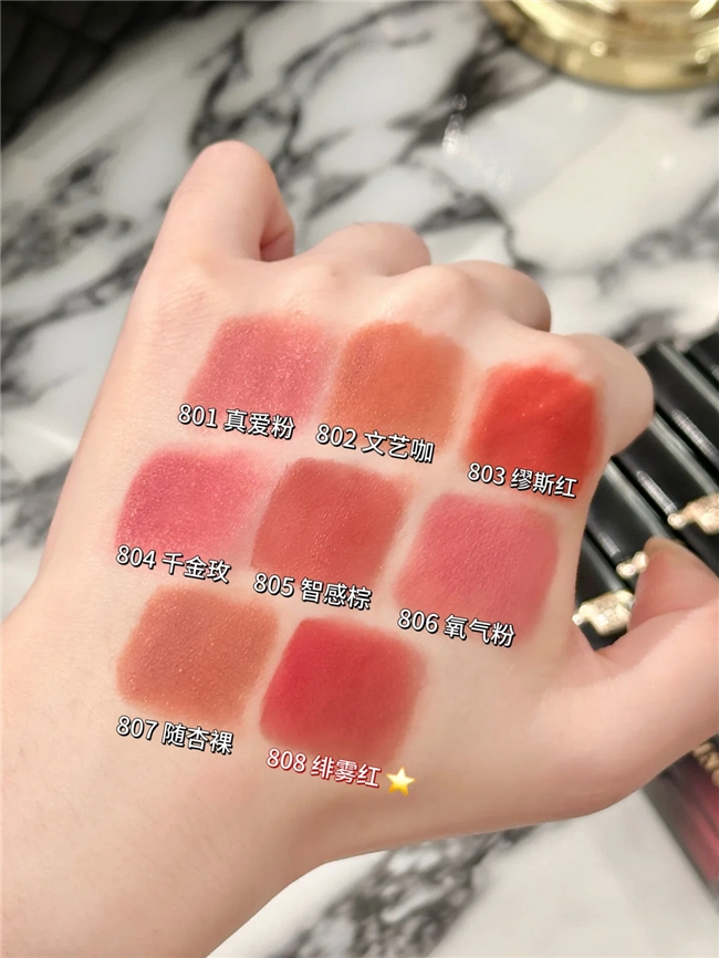 其中,#801真爱粉为优雅裸玫瑰色,色调柔和,黄皮可轻松驾驭;#802文艺咖是暖调土橘色,自带松弛文艺气质;#803缪斯红为明媚番茄红,色彩鲜活,彰显大女主气场;#804千金玫呈现春夏野玫瑰质感,自带矜贵格调;#805智感棕为百搭红棕色,色调沉稳,营造从容笃定的精英感;#806氧气粉为蜜桃粉调,灵动清新;#807随杏裸为清淡乌龙杏色,贴近原生唇色,日常涂抹无违和感;#808绯雾红为赤红豆沙调,色彩浓郁却不艳丽,自然衬托气色。