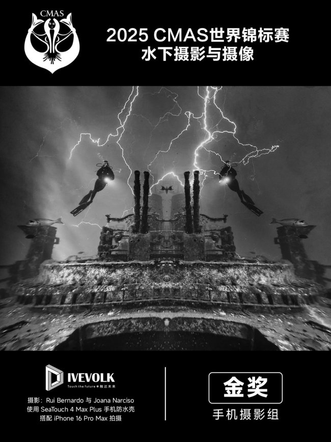 器材与流程方面,他们使用 iPhone 16 Pro Max 搭配DIVEVOLK SeaTouch 4 Max 全触屏水下壳,并通过Dive.IT摄影应用实现“镜像”效果。拍摄采用手动模式,调整曝光以确保潜水员与船体轮廓清晰、细节明确。拍摄后使用Lightroom加入“闪电”元素营造风暴氛围,并最终转为黑白以增强视觉冲击。