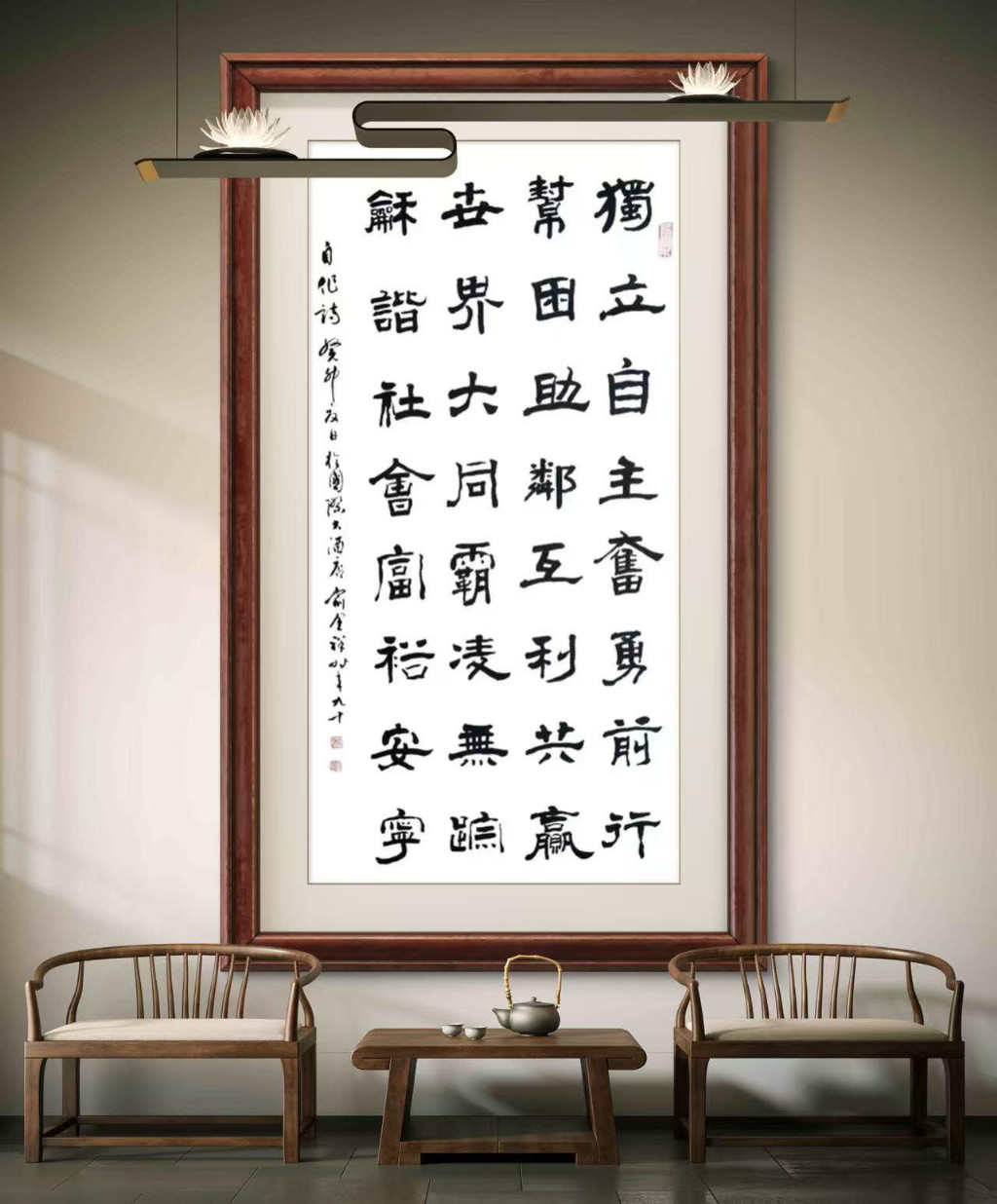 俞金祥的作品不仅仅是一种艺术形式的展现,更传递着深厚的文化内涵。他的作品融合了楷、隶、篆三种书体,这本身就是对中国传统书法文化的一种传承和弘扬。通过这种融合,他将不同历史时期的书法文化元素汇聚在一起,展现了中国书法艺术的源远流长和博大精深。