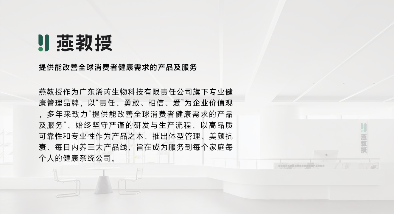 燕教授自创立以来,始终以 “责任 | 勇敢 | 相信 | 爱” 为核心价值观,以 “提供能改善全球消费者健康需求的产品及服务” 为使命,专注于精准营养与功能型健康食品的研发。品牌深耕气血养护、体重管理等核心赛道,凭借严谨的科研实力与纯净的产品配方,为不同年龄段、不同生活场景的人群提供可信赖的健康解决方案。