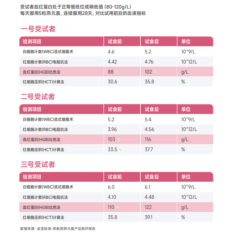 据金至检测 - 燕教授燕元基产品测评报告显示,针对血红蛋白处于正常值低位或稍低值(80-120g/L)的受试者,每日服用 5 粒燕元基、连续服用 28 天后,受试者的血红蛋白、红细胞计数等血液指标均有改善: