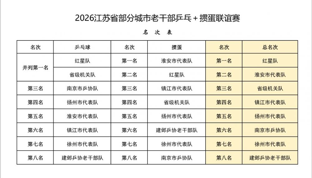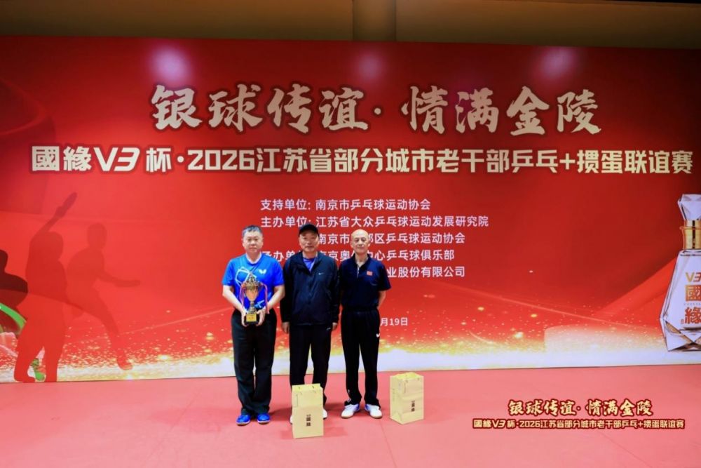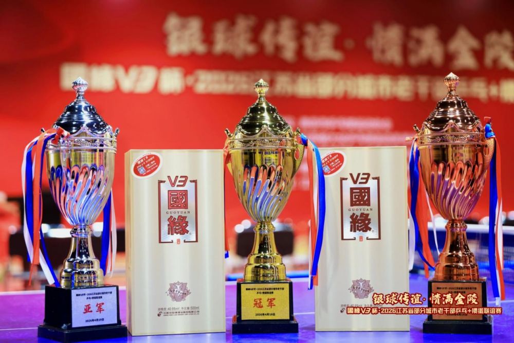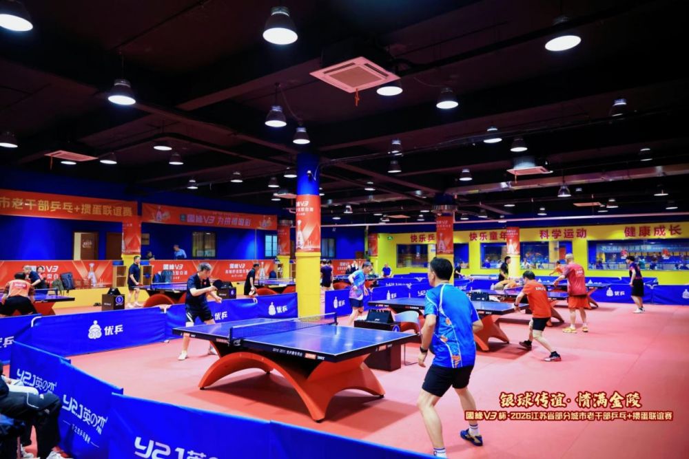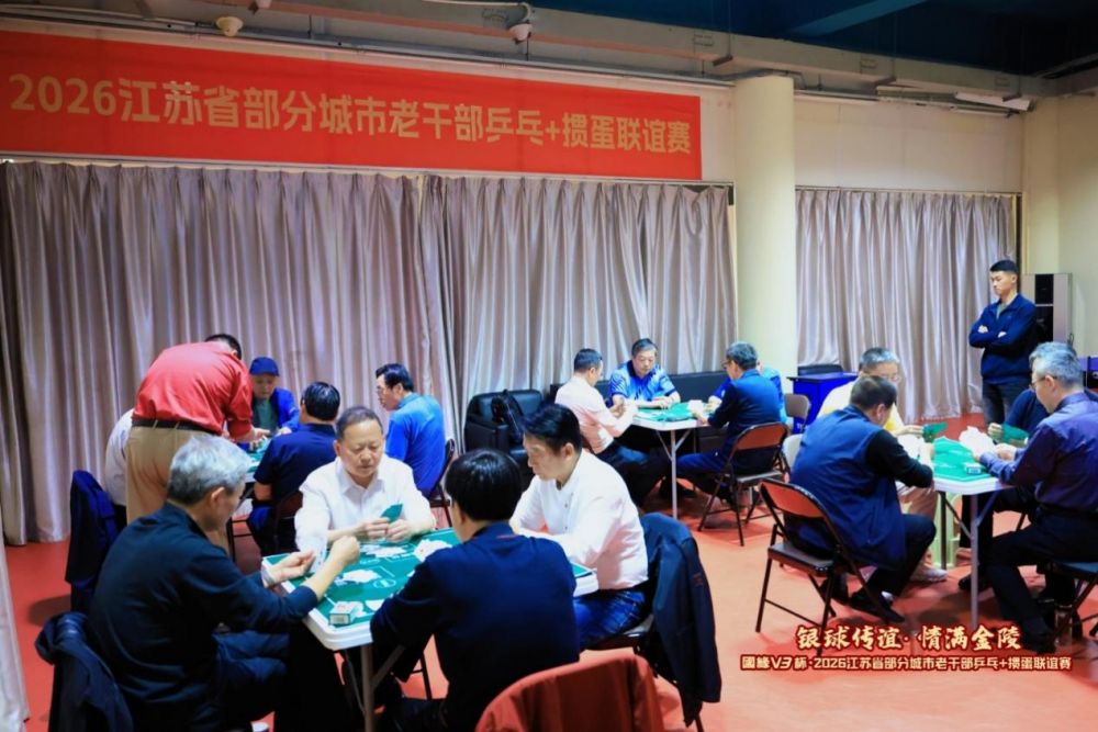 银球传谊 情满金陵。4 月 19 日下午,国缘 V3 杯?2026 江苏省部分城市老干部乒乓 + 掼蛋联谊赛在南京奥体中心乒乓球俱乐部成功举办。本次活动由南京市乒乓球运动协会担任指导单位,江苏省大众乒乓球运动发展研究院、南京市建邺区乒乓球运动协会联合主办,江苏今世缘酒业股份有限公司独家冠名。来自全省多地的八支老干部代表队齐聚赛场,以球会友、以牌传情,充分展现新时代老干部健康向上、老有所乐的精神风貌。