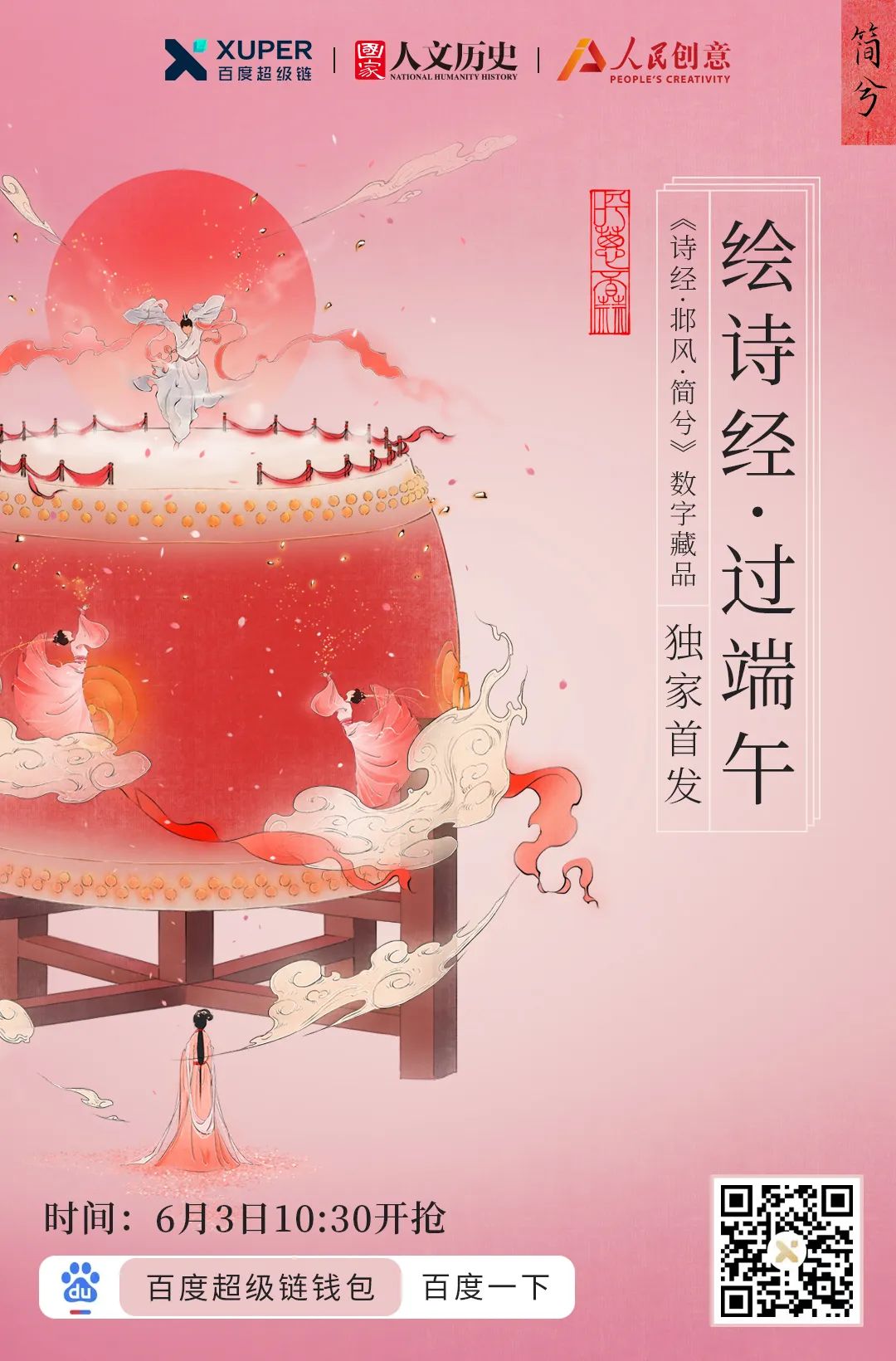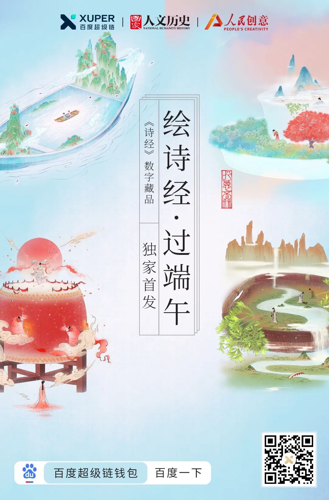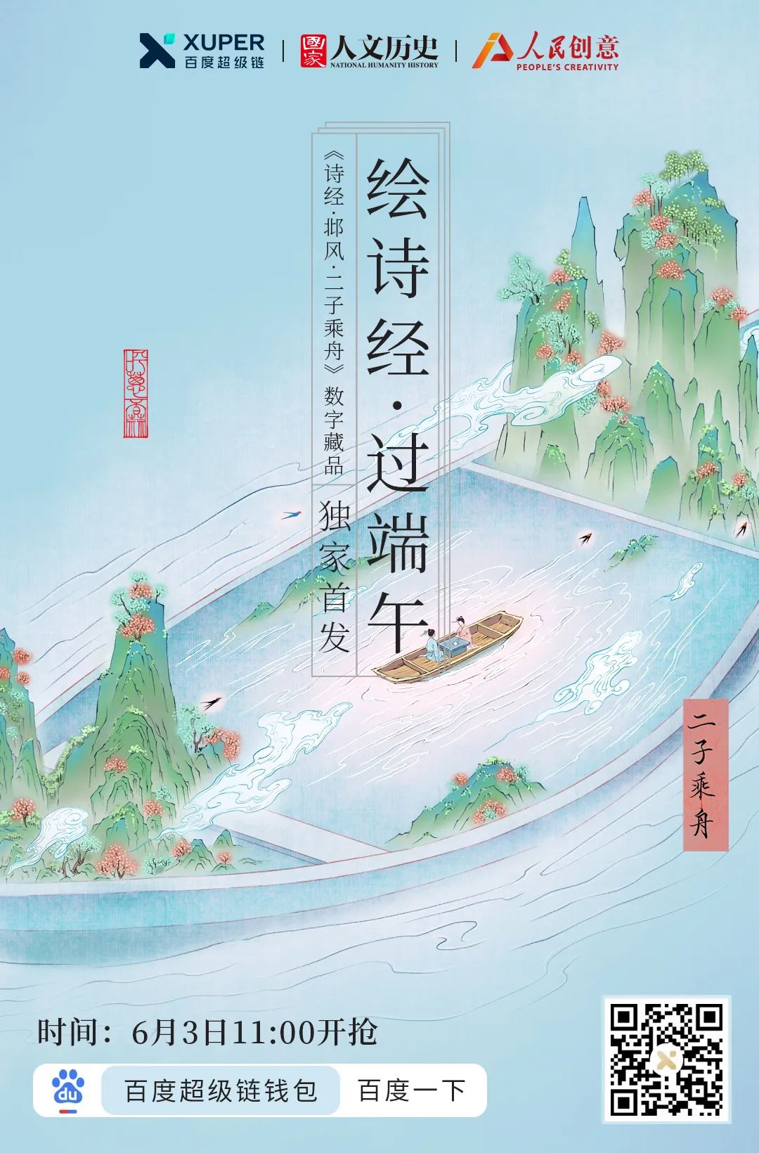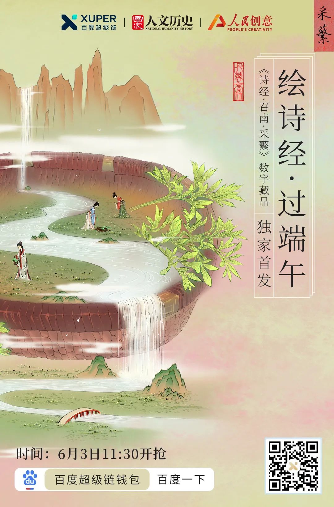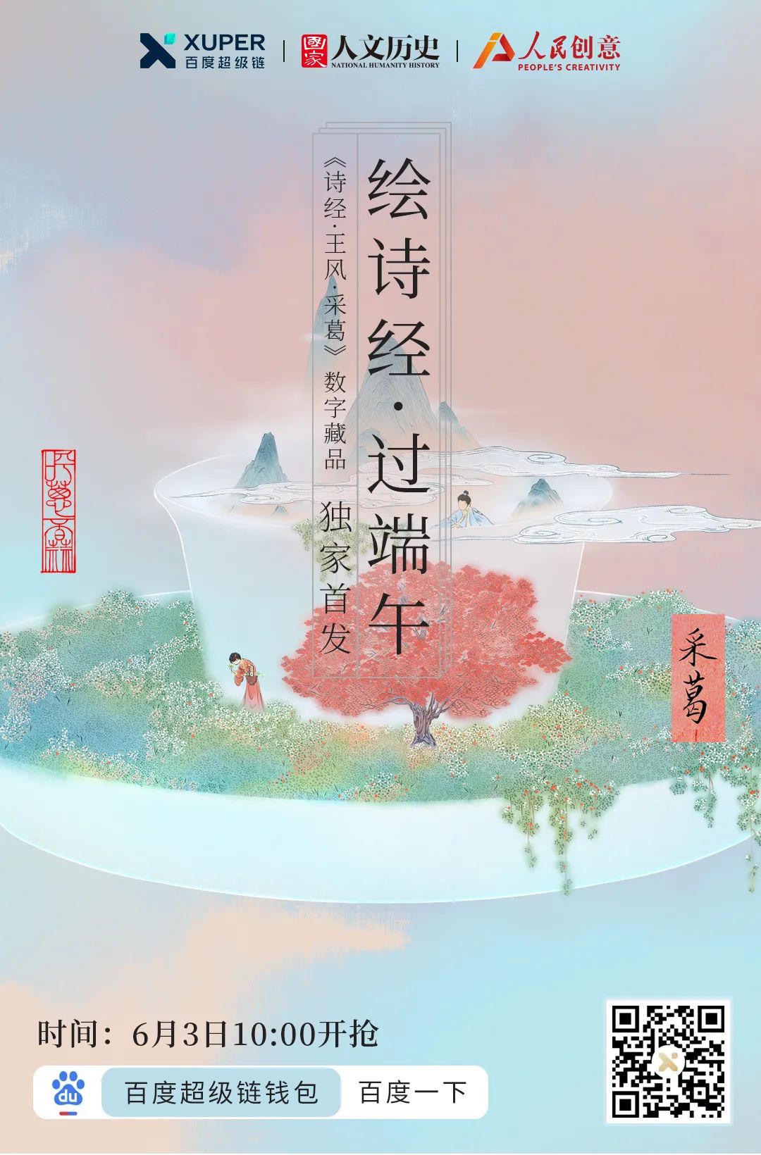 「诗经」主题文化数字藏品将在端午节当天(6月3日)正式上线首发。《采葛》《简兮》《采蘩》《二子乘舟》4幅数字藏品于上午10:00至11:30依次发布,每30分钟发售一幅,每幅限量发售2999份。用户可在百度APP搜索「诗经」直达数字藏品页面进行收藏购买,此次发售仅针对安卓系统手机用户开放。 为了让更多用户通过数字化感受诗经字里行间中带来的文化意境,让文化通过数字化方式走进寻常百姓家,此次,凡购买且集齐4款数字藏品,平台将随机抽取20位幸运用户,获得来自故宫文具的限量款好礼 “四时花景-果禽来熟款书签“一份。幸运用户名单将在6月6日公布在“百度超级链“公众号。在收藏「诗经」主题文化数字藏品的同时获得一份文化惊喜。